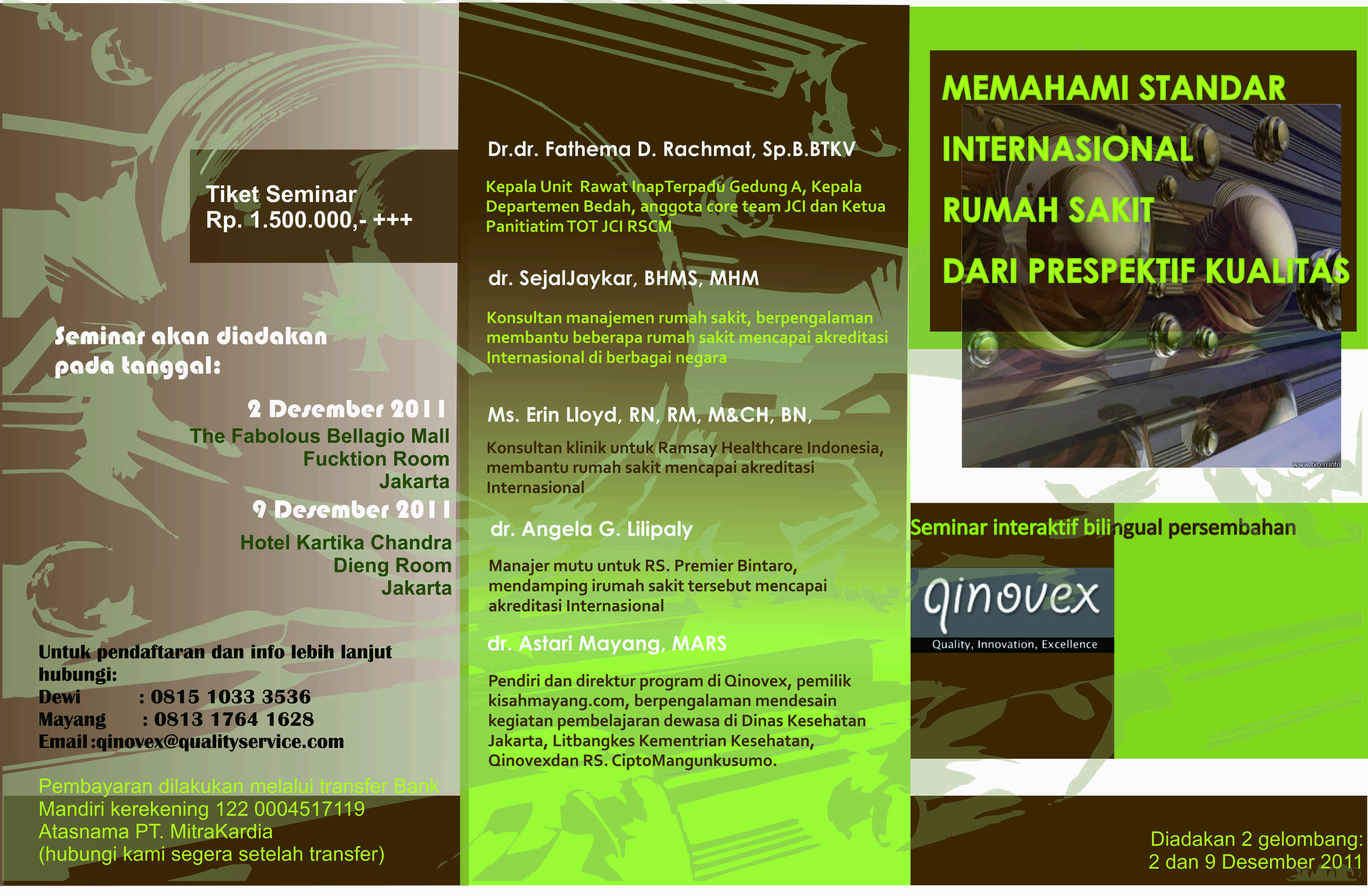 Yth, Sejawat, RS anda telah berkomitmen untuk akreditasi internasional…? Atau sedang berpikir kearah sana…? Pada tanggal 26 November 2011, QINOVEX akan mengadakan seminar tahap lanjut bagi peserta yang berpengetahuan dasar standar internasional. Bermanfaat juga untuk yang akan menjalani standar akreditasi nasional terbaru. Kami bantu anda pahami cara merangkai kegiatan persiapannya. SELAMAT TINGGAL SEMINAR YANG MEMBOSANKAN! Sesi interaktif Qinovex beri pengalaman praktis sehingga mendapat gambaran nyata kegiatan sesungguhnya.